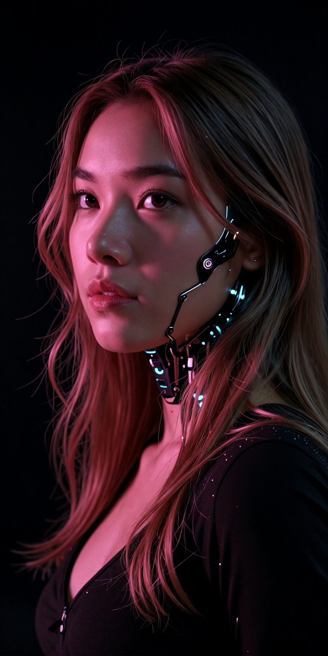 in the style of cksc, close-up portrait, beautiful 1girl woman, long wavy hair cascading hair around her facem, Subtle mechanical features integrated into her face and neck, blending seamlessly with her natural beauty, chiaroscuro style, with extreme contrast between light and shadow, creating a dramatic, moody effect, background is completely black, neon pink light illuminating select areas of her face, hair, and mechanical elements, adding a futuristic glow, contrast of neon pink and black enhances the surreal atmosphere, blending organic beauty with mechanical details for a striking cybernetic aesthetic. masterpiece,best quality,amazing quality