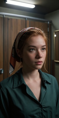 A 25-year-old ginger woman with updo hairstyle and freckles, green eyes, and subtle arousal expression, captured in a close-up portrait within a dimly lit changing room with weathered wooden panels and a single hanging silk scarf, rendered in analog film style using a DSLR with Cine-Nikkor retro vignetting lens, featuring deep emerald and ochre tones, volumetric lighting piercing through a high window to cast sharp chiaroscuro shadows across her sharp jawline and collarbone, sharp focus on the intricate freckles and texture of her silk blouse collar, subtle film grain overlay, and a closed vintage wooden changing room door visible in the blurred background with a faint reflection of a brass mirror on the door surface.