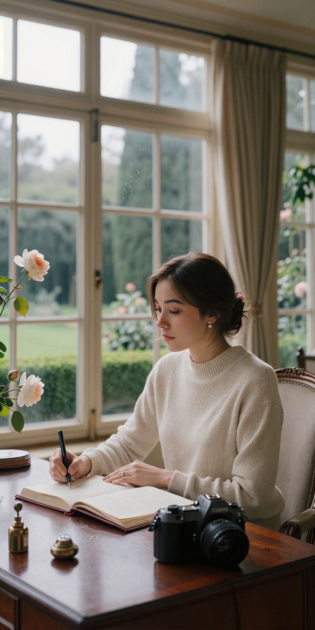 A serene, sunlit conservatory with floor-to-ceiling windows revealing a manicured garden of clipped box hedges and climbing roses, a woman in a tailored ivory cashmere sweater and pearl earrings sits poised at a vintage walnut writing desk, her hands resting lightly on an open leather-bound ledger; the scene captured with a Canon EOS-1D X Mark III DSLR and a 85mm f/1.2L Cine-Nikkor lens featuring pronounced retro vignetting, shallow depth of field isolating her calm expression as morning light filters through sheer linen curtains, casting delicate volumetric rays that illuminate dust motes in the air, while the film grain texture of Kodak Portra 400 adds organic depth to every meticulously rendered detail—from the subtle weave of her sweater to the faint condensation on a crystal water carafe beside her, framed in a tight close-up that emphasizes the quiet luxury of her composed demeanor amid the ordered elegance of the space.
