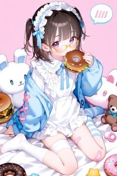 masterpiece,absurdres,best quality,petite,high quality,chromatic_aberration,loli,//,Style1,food,1girl,stuffed animal,donut,stuffed toy,solo,brown hair,stuffed rabbit,holding,bandaid,looking at viewer,sitting,holding food,jacket,long sleeves,purple eyes,thighhighs,striped thighhighs,blush,bandaid on leg,dress,socks,striped clothes,twintails,asymmetrical legwear,frills,white dress,wariza,two side up,pillarboxed,spoken blush,bandages,blue bow,single thighhigh,frilled hairband,sleeves past wrists,star (symbol),open jacket,open clothes,eating,bandaged leg,ribbon,no shoes,hairband,blue jacket,on bed,puffy sleeves,hand up,medium hair,teddy bear,long hair,blue ribbon,puffy long sleeves,maid headdress,indoors,frilled dress,speech bubble,single sock,short hair,holding stuffed toy,unconventional maid,closed mouth,mismatched legwear,simple background,bangs,blue cardigan,bandaid on knee,burger,short twintails,kneehighs,yellow-framed eyewear,pink background,rabbit,<lora:22222.NAI4h:0.8>,