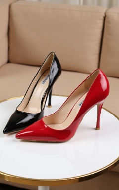 High Heel, Photograph of two high-heeled shoes placed on a round, white table with a gold rim. The left shoe is glossy black with a pointed toe, while the right shoe is glossy red with a pointed toe. Both shoes have a high, stiletto heel. The background features a beige, textured fabric sofa.