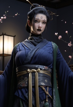 masterpiece,best quality,amazing quality,high resolution,ultra-detailed,absurdres,(looking at viewer:1.1),upper body,(Dark room:1.3),(moody lighting:1.1),peach blossom,falling petals BREAK large breasts,foursister,solo,1girl,black hair,facial mark,forehead mark,hair ornament,hair bun,hair stick,chinese clothes,sash,belt,toeless legwear,black_eyeshadow,black lips,Willow-shaped eyebrows,glamor,puffy breasts,pointy_breasts BREAK photorealistic details,<lora:QQSillfoursisterV1:0.8>,