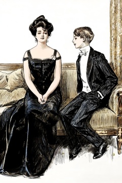 A woman and a young boy are sitting on a sofa in a living room. On the left, a woman with a slender, elegant figure sits on a plush, upholstered sofa. Her voluminous hair is styled in a bouffant updo, with a few strands framing her face. On the right is a young boy, shown in side profile view, with his hand in his pocket, gazing at the woman on the left.