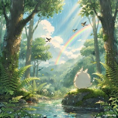 jzbj,Miniature figures,Studio Ghibli style, a serene forest scene just after the rain. The sky is clearing, with soft rays of sunlight breaking through the clouds and illuminating the wet forest. Everything is glistening with moisture—tree leaves, ferns, and the forest floor all reflect the light. A white creature, its round body standing on a mossy rock, its soft fur dry now and glowing in the sunlight, looks out at the freshly washed forest. A rainbow arches faintly in the distance, and small birds start to sing, filling the air with cheerful sounds. The scene has a bright, hopeful atmosphere, capturing the beauty of a forest rejuvenated by rain.
