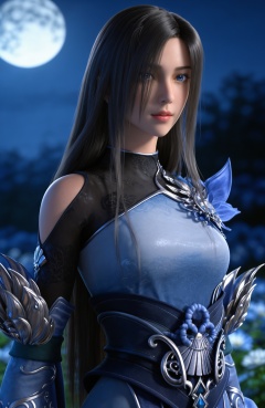 <lora:完美世界-重瞳者Pony:0.8> 1girl, black hair, long hair, blue dress, shoulder cutout, detached sleeves, long sleeves, sash,, 1girl,solo,shiny,shiny_hair,upper_body,fair_skin,white_skin,shiny_skin,shiny,Ivory_skin,looking at viewer,cinematic lighting,volumetric lighting,solo focus,blurry background,depth of field,night,sky,night sky,full moon,moonlight,