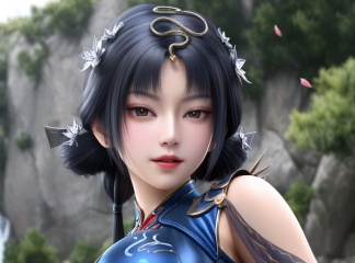 masterpiece,best quality,amazing quality,high resolution,ultra-detailed,absurdres,(looking at viewer:1.5),(moody lighting:1.1),waterfall,peach blossom,falling petals BREAK large breasts,jinxiaochai,1girl,solo,dress,black hair,hair ornament,blue dress,chinese clothes,clothing cutout,gloves,brown patterned thigh-high stockings,fishnet texture,cleavage cutout,long hair,hair bun,realistic,shoes BREAK photorealistic details,<lora:QQSilljinxiaochaiV1:0.8>,