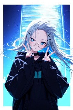 masterpiece, best quality, amazing quality, absurdres, 1girl, solo, white straight hair, long hair, looking at viewer, blue eyes, long sleeves, jewelry, ((upper body shot)), head tilt, hairclip, hood, nail polish, collar, symbol-shaped pupils, v, hoodie, x hair ornament, blue nails, double v, black hoodie, neon lights, ((windy)), (over sized black hoodie), (clothes and hair blown strongly by the wind, windblown hair), BREAK inner hair color, shy, blushed, emotionless, (flowing hair), (no bangs, wide forehead), large round glasses, (narrow eyes, tsurime), pale skin, light particles, colorful particles, blue and green gradient background with white border, umemiart, Gl0ss_style,backlight, lens flare,