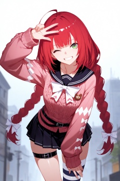 sola7764, [(rhasta:0.6)::12],1girl, ukinami yuzuha, ahoge, aran sweater, arm up, belt, black skirt, bow, bowtie, braid, breasts, cable knit, collarbone, green eyes, hair ribbon, leaning, light smile, long hair, long sleeves, looking at viewer, miniskirt, leaning forward, head tilt, one eye closed, pink sleeves, pink sweater, pleated skirt, red hair, ribbon, sailor collar, single bare leg, single thighhigh, skirt, small breasts, solo, striped clothes, striped thighhighs, sweater, smile, grin, thigh strap, thighhighs, twin braids, very long hair, w, white bow, white ribbon, outdoors, depth of field, masterpiece, best quality, absurdres,