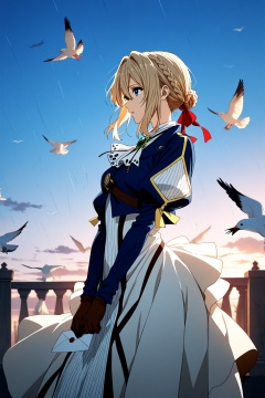 1woman,dynamic pose,small nose,highres,absurdres,1girl,violet evergarden,green gemstone,bird,blonde hair,braid,blue jacket,dress,white ascot,solo,ribbon,gloves,red ribbon,jacket,hair ribbon,puffy sleeves,long sleeves,v arms,gem,white dress,ascot,jewelry,hair intakes,juliet sleeves,from side,brooch,profile,hair bun,sky,own hands together,white bird,cropped jacket,brown gloves,looking ahead,french braid,long dress,arch,outdoors,braided bun,short hair,medium hair,hair between eyes,railing,flock,standing,parted lips,blue eyes,closed mouth,evening,sidelocks,blue sky,single hair bun,bolo tie,looking down,holding,envelope,cowboy,from the side,looking up,in rain,a small stream of water running down over her face,standing in the rain,spinning motion,dynamic pose,high contrast shadowing,fractal,swirly,candid style. high contrast,grain effect prominent throughout image,high contrast lighting creating dramatic shadows,grainy film-like texture,
