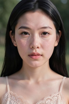 Photograph of close-up a young woman with long black hair and skin is light in tone with a subtle pinkish hue, and fine, short, light brown hairs are visible across the surface. The texture of the skin appears slightly rough with small. She has a slender build and is wearing a lace crew neck camisole with thin spaghetti straps. The lace features intricate floral patterns and small, shimmering sequins. She gazes directly at the camera with a neutral expression. The background is outdoors, softly lit with sunlight that creates subtle shadows and highlights on her face and shoulders. The overall style is natural and minimalistic, emphasizing her delicate features and the texture of the lace fabric.