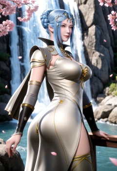 masterpiece,best quality,amazing quality,high resolution,ultra-detailed,absurdres,(looking at viewer:1.1),(moody lighting:1.1),waterfall,peach blossom,falling petals BREAK large breasts,huge ass,narrow waist,wide hips,tangyuehua,1girl,solo,light blue hair,hair ornament,hair bun,dress,sidelocks,braid,elbow gloves,realistic,brown eyes,high collar,necklace,detached sleeves,golden cross decoration,jewelry,armor,long hair,cape,thighhighs,thigh boots,from behind BREAK photorealistic details,<lora:QQSilltangyuehuaV1:0.8>,