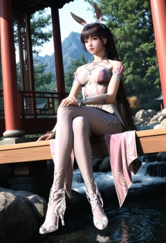 masterpiece,best quality,amazing quality,high resolution,ultra-detailed,absurdres,(looking at viewer:1.1),full body,(moody lighting:1.1),forest,east_asian_architecture,stream BREAK large breasts,xiaowu,1girl,solo,brown hair,long hair,brown eyes,dress,rabbit ears,ponytail,hair ornament,pink dress,metal collar,necklace,realistic,bare shoulders,jewelry,collar,pantyhose,high heels,sitting,(crossed legs:1.3) BREAK photorealistic details,<lora:QQSillxiaowuV1:0.8>,
