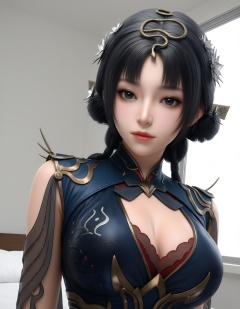masterpiece,best quality,realistic,cinematic,detail eyes,(ultra-detailed),perfect composition,intricate details,absurdres,detailed face,high quality,high res,8K,<lora:X_jinxiaochai_IL4.0:0.8>,black hair,black eyes,hair bun,1girl,long hair,breast,big breasts,hair_ornament,dress,simple background,white_background,bed,looking_at_viewer,upper_body,window,