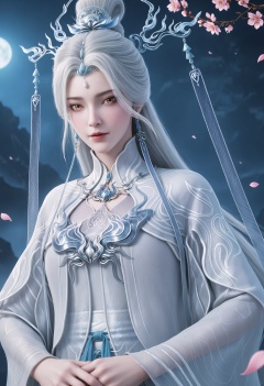 (upper_body:1.2),(looking at viewer:1.1),masterpiece,(best quality),smog,Dark room,dim lighting,peach blossom,falling petals,<lora:YQ_Illustrious光辉v5_剑妈_服装2_V1:0.8>,q1528437228,solo,1girl,white hair,long hair,jewelry,hair ornament,earrings,hair bun,chinese clothes,dress,long sleeves,white dress,yellow eyes,wide sleeves,forehead mark,brown eyes,robe,single hair bun,tassel,facial mark,