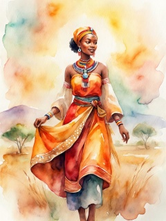 Watercolor portrait of an African woman in vibrant traditional attire, warm orange and red fabrics, soft savannah light, delicate transparent washes, cultural jewelry details, dreamy atmosphere, dynamic action pose.,aquawhisper style