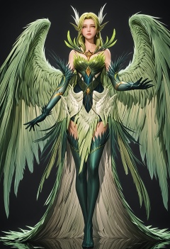 (standing full_body:1.1),score_9,score_8_up,masterpiece,(best quality),intricate details,facing viewer,(looking at viewer:1.1),<lora:YQ_pony_biji_V4:0.8>,q1528437228,solo,1girl,long hair,green hair,feathers,green eyes,blonde hair,hair ornament,pointy ears,wings,gloves,dress,green wings,elbow gloves,jewelry,feathered wings,green dress,thighhighs,armor,yellow eyes,earrings,green feathers,multiple wings,BREAKscore_9,score_8_up,masterpiece,(best quality),perfect anatomy,(hourglass),perfect face,(simple background,pure black background,black background:1.1),fair_skin,shiny_skin,Ivory_skin,