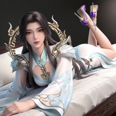 full body,legs,long legs,hand on hip,bed,dynamic_angle,dutch angle,on_stomach,feet up,bed,