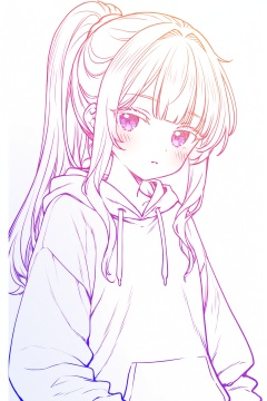 1girl, solo, hood, hoodie, purple eyes, white background, upper body, looking at viewer, long hair, simple background, ponytail, hood down, bangs, sidelocks, pillarboxed, blue hair, drawstring, white hair, closed mouth, white hoodie, blue hoodie, colored eyelashes, blush, long sleeves, hair intakes, eyebrows visible through hair, expressionless, parted lips, hair over shoulder, eyelashes, dot nose, blunt bangs,(colored lineart)