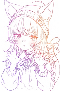 1girl, :t, animal ears, bandaid, bandaid on cheek, bandaid on face, bandaid on nose, beanie, cat ears, cat girl, cat tail, claw pose, hat, long hair, long sleeves, looking at viewer, multicolored nails, nail polish, portrait, ribbon, simple background, tail, tail ornament, tail ribbon, white hair, white hat,(colored lineart)