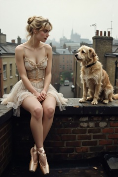 High-angle view of a young woman with wispy blonde hair styled in a high, slightly messy ballerina bun secured with a small pale ribbon, sitting on the weathered brick ledge of a London rooftop. She is sitting on the left, dressed in a delicate, vintage-style champagne-colored ballet tutu with thin straps and a layered tulle skirt, paired with matching satin pointe shoes and ribbons crisscrossing her ankles. Her posture is poised yet relaxed, sitting with her legs dangling over the edge and her hands gently clasped in her lap, as she gazes with a curious and gentle expression at a small, scruffy tan terrier dog sitting directly across from her on the right. The dog has shaggy, textured fur and sits upright, looking back at her with an alert and friendly demeanor. The background is a soft-focus, hazy urban landscape of London chimneys and rooftops under a muted, overcast sky.