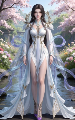 black hair,long hair,brown eyes,earrings,hair_ornament,chinese clothes,cleavage cutout,henren white dress,long_sleeves,nature,water,flowers,day,sunlight,baoshi,full body,high heels,purple footwear