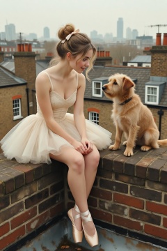 High-angle view of a young woman with wispy blonde hair styled in a high, slightly messy ballerina bun secured with a small pale ribbon, sitting on the weathered brick ledge of a London rooftop. She is sitting on the left, dressed in a delicate, vintage-style champagne-colored ballet tutu with thin straps and a layered tulle skirt, paired with matching satin pointe shoes and ribbons crisscrossing her ankles. Her posture is poised yet relaxed, sitting with her legs dangling over the edge and her hands gently clasped in her lap, as she gazes with a curious and gentle expression at a small, scruffy tan terrier dog sitting directly across from her on the right. The dog has shaggy, textured fur and sits upright, looking back at her with an alert and friendly demeanor. The background is a soft-focus, hazy urban landscape of London chimneys and rooftops under a muted, overcast sky