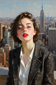 High-angle, close-up of a woman with short, dark hair blowing across her face on a high-rise rooftop in New York City, with her head tilted sideway slightly. She wears bold red lipstick and a crisp white button-up shirt underneath a dark, textured houndstooth blazer. The camera uses a wide-angle lens, creating a slight fish-eye distortion that emphasizes the vast urban landscape below. In the background, the iconic Empire State Building rises prominently against a clear blue sky dotted with soft clouds
