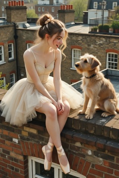 High-angle view of a young woman with wispy blonde hair styled in a high, slightly messy ballerina bun secured with a small ribbon, sitting on the  brick ledge of a London rooftop. She is sitting on the left, dressed in a delicate, vintage-style champagne-colored ballet tutu with thin straps and a layered tulle skirt, paired with matching satin pointe shoes and ribbons crisscrossing her ankles. Her posture is poised yet relaxed, sitting with her legs dangling over the edge and her hands gently clasped in her lap, as she gazes with a curious and gentle expression at a small, scruffy tan terrier dog sitting directly across from her on the right. The dog has shaggy, textured fur and sits upright, looking back at her with an alert and friendly demeanor.