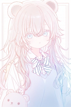 shirokumata beru, 1girl, animal bag, bear bag, blue eyes, bow, bowtie, grey hair, hair between eyes, long hair, looking at viewer, solo, striped bow, striped bowtie, striped clothes, upper body, virtual youtuber, commentary request, highres, wide shot,lineart