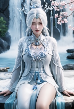 masterpiece,best quality,amazing quality,high resolution,ultra-detailed,absurdres,(looking at viewer:1.1),(moody lighting:1.1),waterfall,peach blossom,falling petals BREAK large breasts,jianma,1girl,solo,white hair,long hair,jewelry,hair ornament,earrings,realistic,dress,chinese clothes,hair bun,white dress,long sleeves,white eyelashes,yellow eyes,tassel,wide sleeves,barefoot BREAK photorealistic details,<lora:QQSilljianmaV1:0.8>,