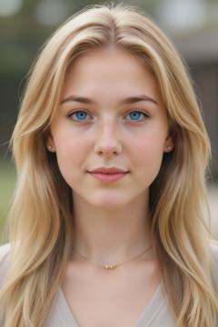 A young Caucasian woman, appearing to be in her early twenties, is centered in a medium close-up shot, gazing directly at the viewer. Her light skin is accented by natural freckles. She has long, wavy blonde hair framing her face. Her eyes are a striking blue, and she wears small, round stud earrings and a delicate gold necklace. She is wearing a neutral-toned top. Her expression is neutral, bordering on a slight smile, with full lips and a soft facial structure. The background is softly blurred, showing an indistinct outdoor setting, suggesting natural light. The lighting is soft and even, highlighting her features. The composition is clean and focused on the subject's face, with a shallow depth of field. The overall atmosphere is fresh, and the style is naturalistic and clean.