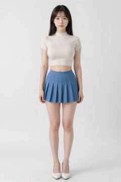 large breasts, stand at attention, Long-distance full-body photo, 年轻女性。她肤色白皙,留着齐肩的黑色长直发。双臂自然垂于身体两侧。她身穿一件修身的浅色短袖高领露脐上衣,下身搭配一条蓝色百褶短裙,白色高跟鞋。背景是干净明亮的白色背景。