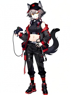 XNXX, A young male-presenting VTuber character with short, messy dark grey hair and sharp wolf ears wears a black-and-red gaming outfit: a cropped black hoodie with red accents, black cargo pants with tool pouches, and a black gaming headset around his neck. He has sharp amber eyes, a confident smirk, and a small black wolf tail. His one hand holds a gaming controller, while the other rests on his hip; he wears black thigh-high socks with red stripes and black gaming sneakers with red accents. A black baseball cap with a red wolf logo sits atop his hair, which is styled with a small red hair clip.