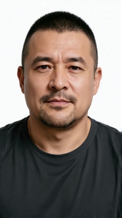 立军,一位中年男子的正面像,整洁的黑色短平头,额头和眼睛周围的自然细纹,修剪整齐的胡须(胡子+下巴胡茬),自然的肤色,清晰立体的面部轮廓,平静稳定的眼睛,直视镜头,嘴唇上酷酷的表情。穿着灰黑色修身衬衣,身材为脂包肌身材,纯白色背景,均匀柔和的光线,画面展现出高清逼真的质感,准确还原了照片中的自然皮肤纹理、毛孔和头发细节。