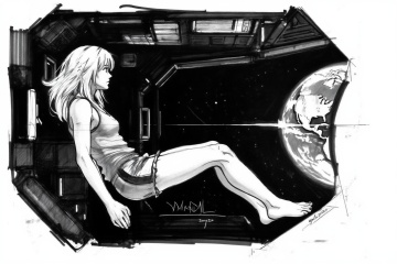 Profile view of a blonde, floating weightless inside a dark space station. She is wearing a **** top, short shorts and barefoot, and looking outside towards earth. She is melancholic, and is thinking of her family back on earth