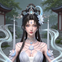 black hair, long hair, blue eyes, forehead_jewel, hair_bun, hair ring, lotus hair flower, beads, crescent hair_ornament, necklace, sash, earrings, bare shoulders, yaoyue white dress,, nature,stone,flowers,