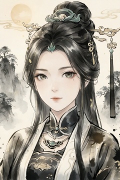Ink-wash style,Song yu,1girl, solo, long hair, looking at viewer, hair ornament, closed mouth,