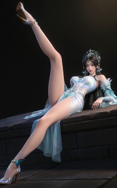 masterpiece,high quality,tall,game cg,highres,(soft light:1.2),(white_skin:0.6),(shiny_skin:0.6),(realistic:1.1),lvjing,,beads,long hair,grey eyes,forehead mark,black hair,forehead_jewel,hair_ornament,tiara,earrings,necklace,qingyi white dress,detached_sleeves,long_sleeves,1girl,solo,bare shoulders,high_heels,jewelry,black_background,simple background,outdoor,
