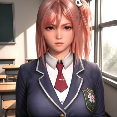 masterpiece,best quality,absurdres,highres,looking at viewer,front view,(scowl),(heavy_breathing),upper body,(glamor:1.1),narrow waist,<lora:Honoka (doa)_ill:0.85>,1girl,solo,1girl,solo,honoka \(doa\),pink hair,one side up,side ponytail,skull hair ornament,school uniform,white collared shirt,school blazer,red necktie,rim light,Volumetric Lighting,Tyndall effect,Cinematic Lighting,fantasy,school desk,school,window,