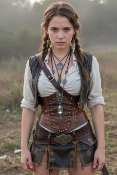 Mood: Cinematic fantasy atmosphere blending raw natural beauty with rugged survivalist elegance, psychological tone conveying strength mixed with vulnerability, emotional resonance of ancient warrior spirit meeting modern sensuality, visual feeling of timeless adventure captured in a single moment of quiet intensity.