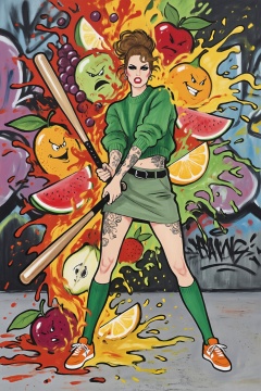 Liquid splash, cartoonish juicy fruits chaos, dynamic pose, dynamic camera, a fashion shoot, an illustration of a woman threateningly holding a baseball bat in her hands, full body tattoo, wearing green short sweater, miniskirt, knee socks, orange sneakers, aggressive facial expression, wall with graffiti in the background,