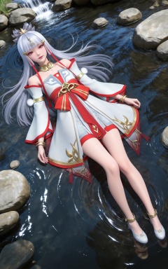 masterpiece,high quality,tall,game cg,highres,(soft light:1.2),(white_skin:0.6),(shiny_skin:0.6),(realistic:1.1),stone,water,(dynamic_angle:1.2),(dutch angle:1.2),full body,lying,
