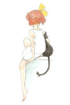A young girl, Kiki, with short red hair tied into a yellow bow, wearing a white dress. She is sitting with her back to the viewer on a light-colored surface, with one leg bent and the other extended. A black cat is sitting beside her, facing her.