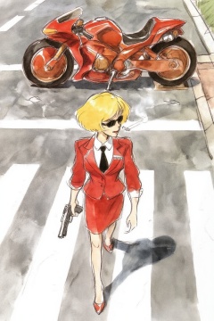 High angle, overhead shot of a Blonde woman walking away from a futuristic motorcycle parked at a zebra crossing. The woman has bob hair, is smoking. She wears a red business suit, white shirt, black tie, and sunglasses. She holds a gun with a confident grip. The motorcycle itself is red, sleek and metallic, with intricate designs and a futuristic vibe