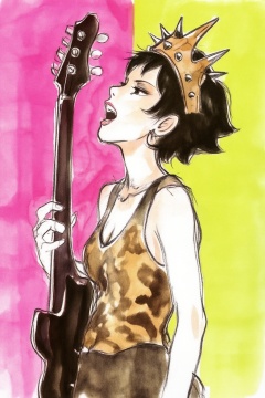 Profile view medium shot of a punk rock musician with her head tilted back in a passionate expression. The subject features short hair, adorned with a matching spiked Liberty crown headpiece. She wear a textured, animal-print patterned sleeveless top and a guitar strap, while holding a dark electric guitar by its neck and body. The composition is centered against a background vertically split between vibrant neon pink on the left and lime yellow on the right. Deep black ink defines the silhouette, while background colors bleed into the highlights on the skin and clothing. The lighting is stark and graphic, emphasizing sharp edges. The overall mood is rebellious, energetic, and powerful.