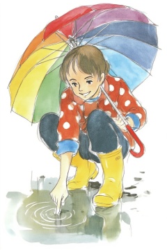 A young woman, angled from slightly above and to the right, crouching low to the ground in a puddle. The young woman is wearing bright yellow rubber boots and a red jacket with white polka dots. The jacket sleeves are pushed up to reveal blue cuffs. The young woman also wears dark blue jeans and has a smile on her face as she extends her right index finger to touch the water in the puddle. She holds a large, open umbrella with rainbow-colored panels and a red handle over her.