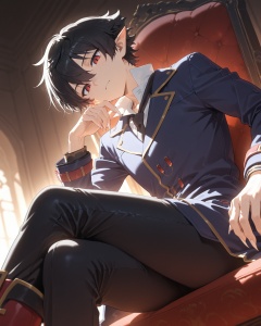 dutch angle, sitting, cowboy shot, looking down, crossed legs, sharp fingernails,