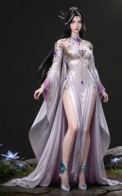 black hair,long hair,blue eyes,single hair bun,multicolored hair,white hair,forehead_jewel,hair_ornament,necklace,bare shoulders,gem,monv white dress,1girl,solo,jewelry,high_heels,