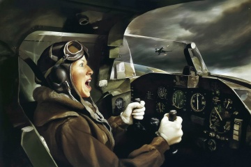 A female pilot, shown in 3/4 view, screaming inside the cockpit of a World War II bomber. The pilot, wearing a vintage leather flight helmet with goggles and a bomber jacket, grips the controls with white-knuckled hands. Her face is contorted in a mix of fear and determination as she yells, her eyes wide with **********. The cockpit is cramped and filled with old-fashioned dials and gauges, with the outside view showing dark stormy clouds and distant anti-aircraft fire