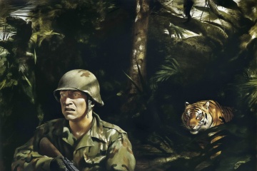 Create a tense jungle scene set in Vietnam, featuring a dense, lush environment with thick foliage, tall trees, and tropical plants. Close-up face of an American Marine, showing fear in his face, shown in 3/4 view, holding a rifle in a ready position. He is dressed in camouflage fatigues and a helmet, blending into the surroundings. Unbeknownst to him, a distance away, a stealthy tiger is following closely behind, partially obscured by the foliage. The tiger's eyes are fixed on the soldier, adding a sense of impending danger to the scene. The overall atmosphere should be one of suspense, with the jungle's dense greenery and shadows heightening the tension.